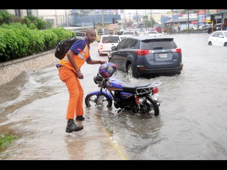 A motorcyclist having trouble navigating the flooded Ward Avenue in Mandeville following recent heavy rain.