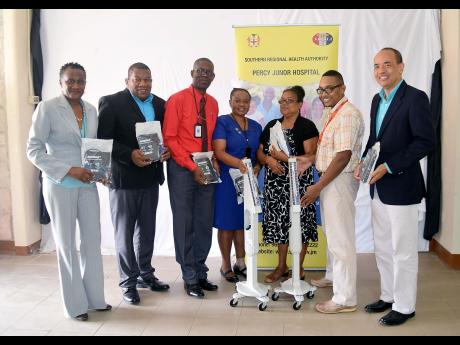 Joyce Powell (third right) is all smiles after presenting two mobile blood pressure units valued at over $140,000 to the Percy Junor Hospital in north east Manchester on behalf of her family members which includes well-known American actress Victoria Rowell from the television series, the Young and the Restless. The donation was made on Tuesday, January 30 in memory of Jane & Cyril Rose, Emma and Alfred Rose, and Jane and Williams Graveney. Funds were raised to purchase the machines at a family reunion in December after the family learnt of the hospital's needs. They are imploring other families to support hospitals in meeting their demands and providing quality health-care to citizens. Photographed also are from left Acting Parish Manager, Manchester Health Services, Sandia Chambers-Ferguson; Regional Director for the Southern Regional Health Authority (SRHA), Michael Bent; CEO for the Percy Junor Hospital (PJH), Carlton Nichols; Director of Nursing Services, Jacqueline Pennicook; Senior Medical Officer of the PJH, Dr. Carlos Wilson and Chairman of the SRHA Board, Wayne Chen.