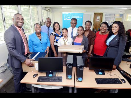 NCB representatives Lloyd Richardson (left) and Tashika Hayden (right) share lens with members of the Glengoffe High School family at the handover ceremony of three new desktop computers, valued at $220,000, to the institution’s Literacy and Numeracy Clinic. The clinic serves some 400 students across Glengoffe High School and its four neighbouring primary schools. The main aim of the clinic is to provide a space for under-performing students, where they can achieve focused assistance to improve literacy and numeracy levels.