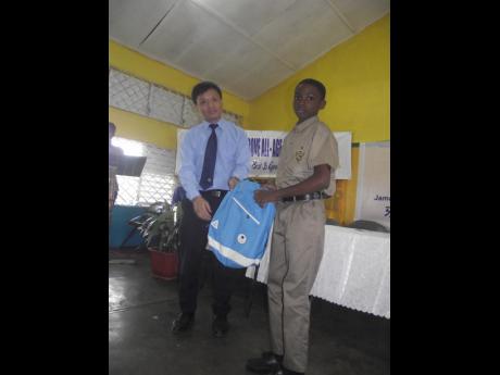 A representative of Jamaica North-South Highway presents gifts to a student of the Golden Grove All-Age School.