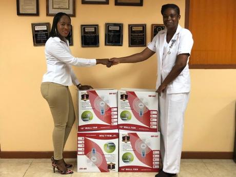 Public Sector Employees Co-op Credit Union Ltd’s marketing and communications manager, KellyAnn Dixon (left), presenting nurse Tamarr Webb of Bellevue Hospital with wall fans to aid with patients’ general well-being.