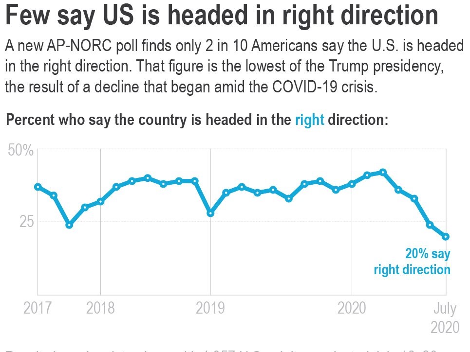 AP-NORC poll: More Americans think country off course; Trump sinks on virus