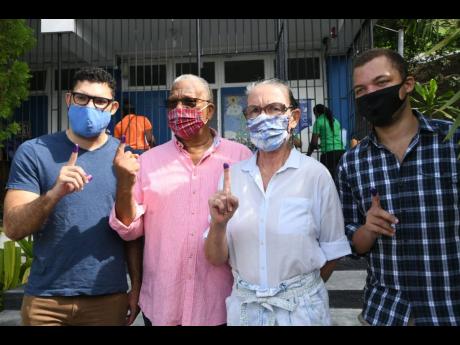 Dr Peter Phillips (second left), Leader of the Opposition and President of the People's National Party, accompaied by his wife Sandra Minitt-Phillips (second right) and their two sons Jacob (right) and Luke, show their fingers after casting their votes at polling division 34 and 35 in the St Andrew North Central constrituency on election day at Reach Academy in Barbican.