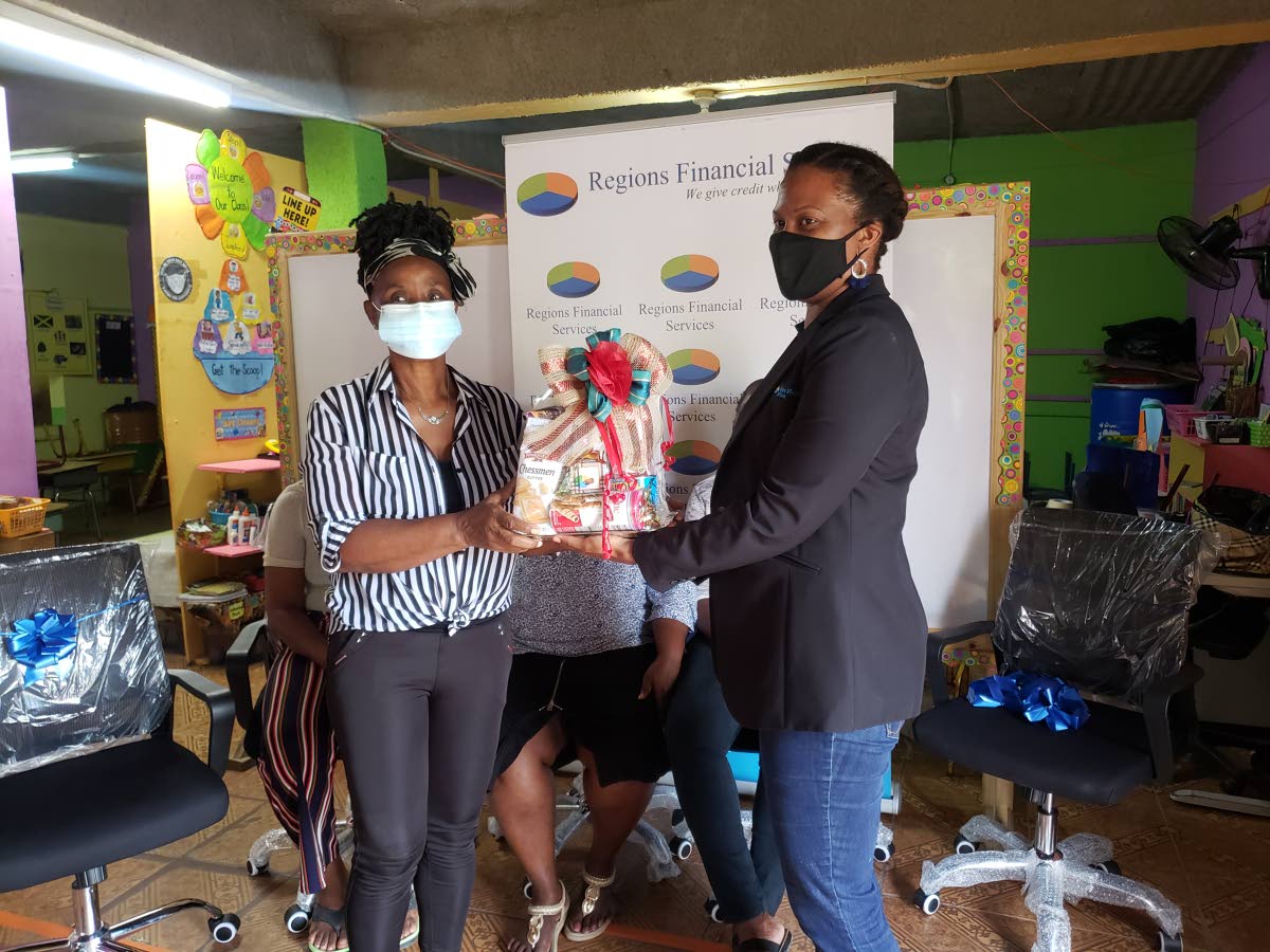 Marketing Director of Regions Financial Services Shanna Thompson (right) presents a gift and five staff chairs to Eugenie Hayden-Allen, principal of Busy Bee Basic School in Yallahs, St Thomas.