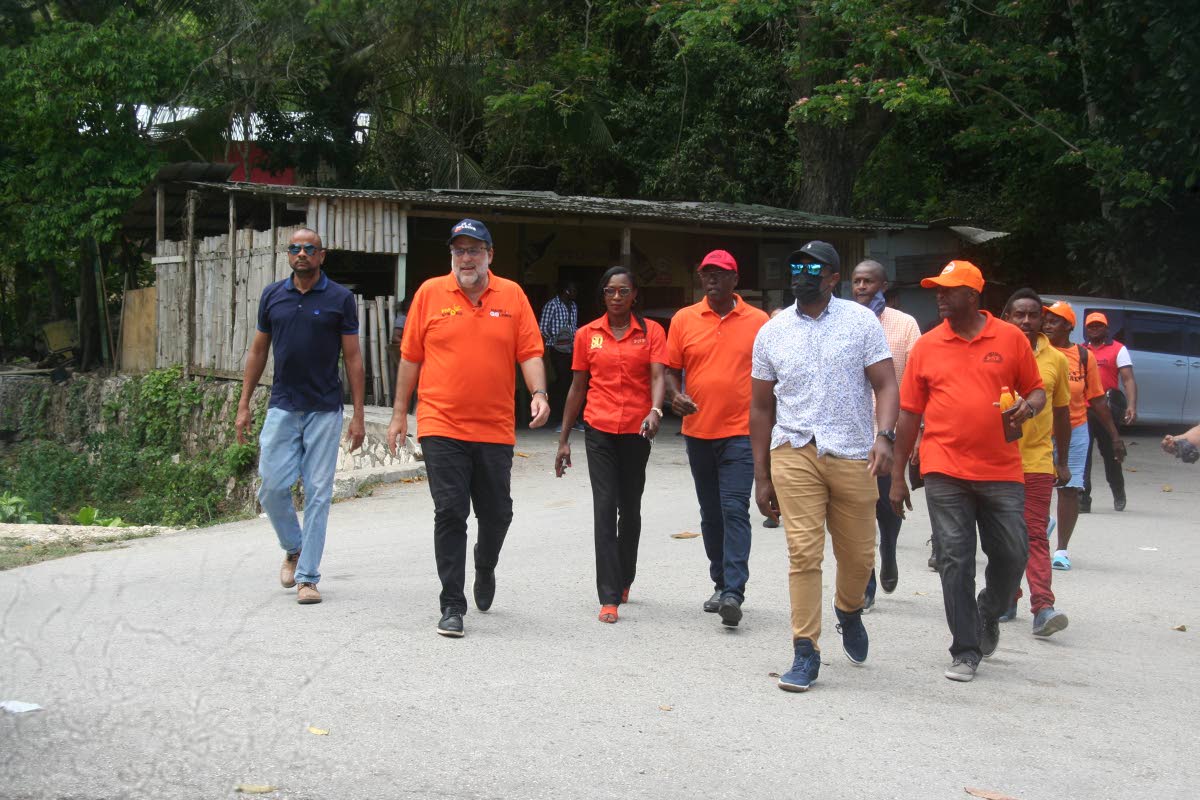 Leader of the Opposition People’s National Party (PNP), Mark Golding (second left), walks the streets and meet the residents of Great River in Hanover, accompanied by PNP caretaker for the Hopewell Division, Jeffrey Brown (fourth left); Councillor for the Sandy Bay Division and Deputy Mayor of Lucea, Andria Dehaney-Grant (third left); and PNP Eastern Hanover Constituency Caretaker, Wynter McIntosh (right, front).