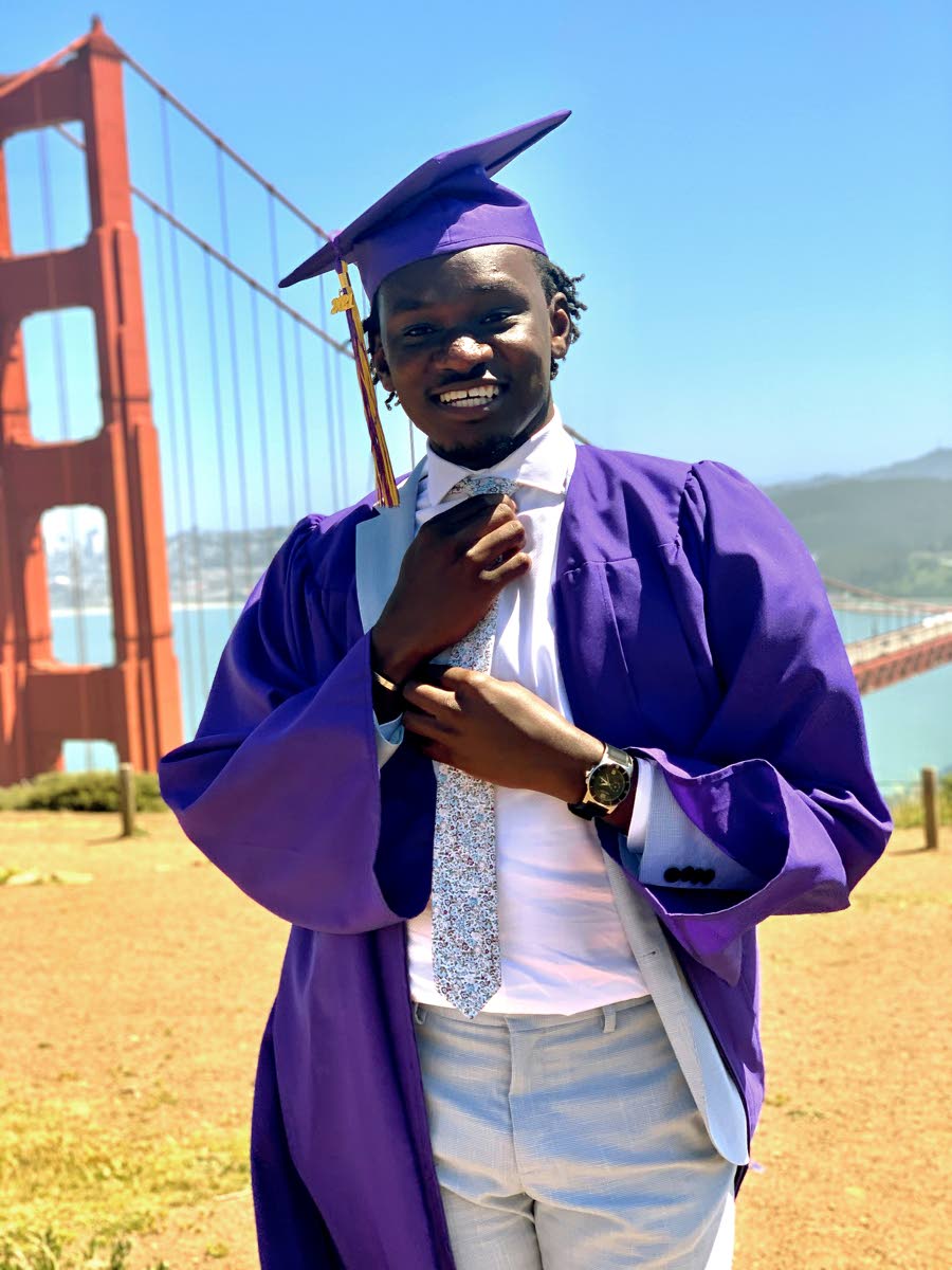 Walters after graduation with California’s signature Golden Gate Bridge in the background.