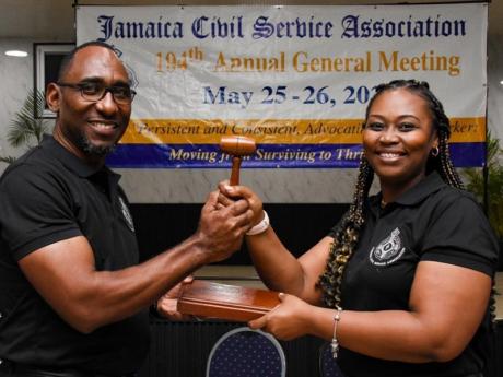 Immediate Past President O'Neil Grant hands over the chairman's gavel to Techa Clarke-Griffiths, the first female elected president of the 104- year-old Jamaica Civil Service Association, on May 26, 2023. -Contributed photo