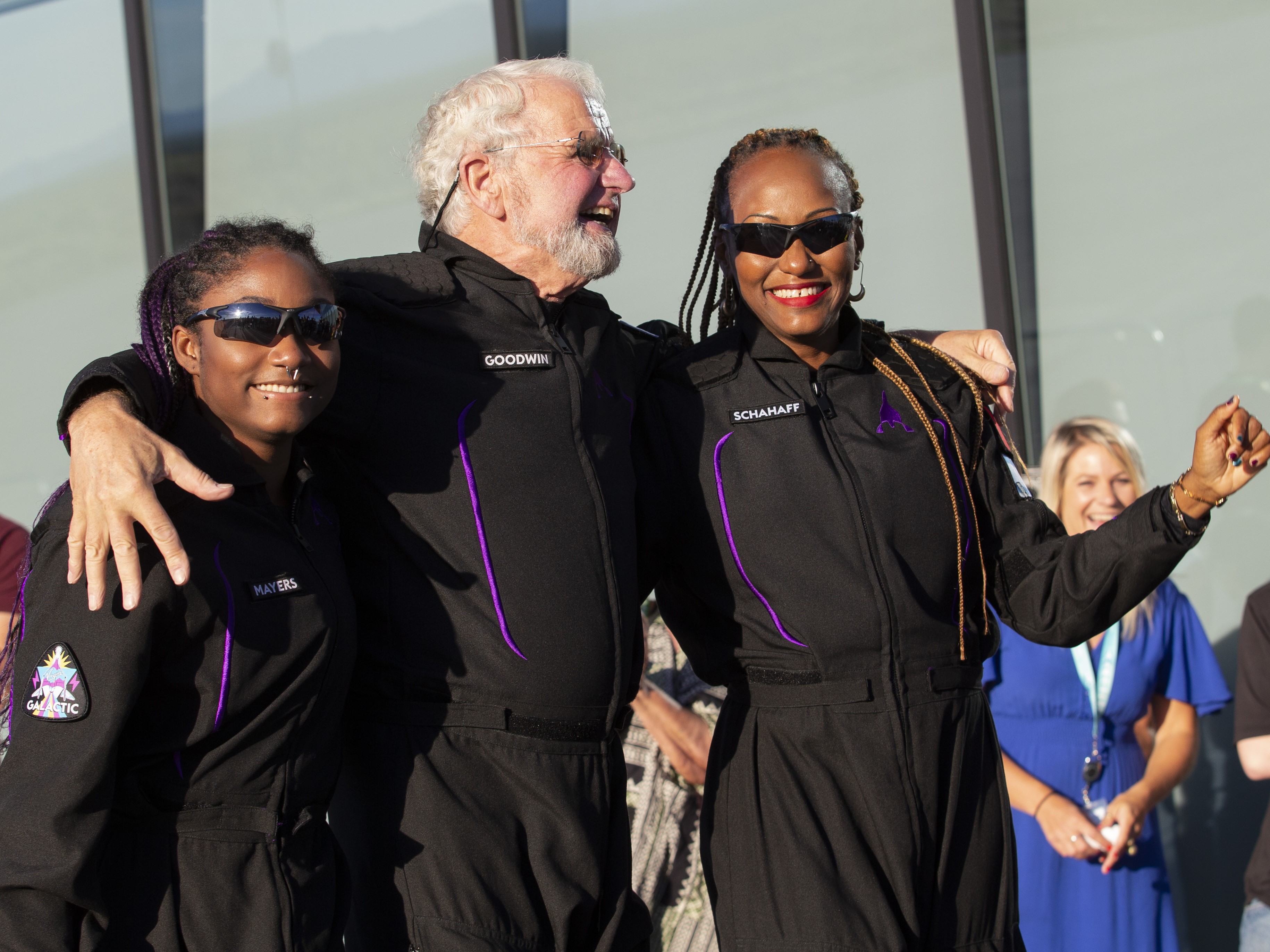 He was joined on the flight by sweepstakes winner Keisha Schahaff, 46, a health coach from Antigua, and her daughter, Anastatia Mayers, 18, a student at Scotland's University of Aberdeen. They high-fived and pumped their fists as the spaceport crowd cheered their return.