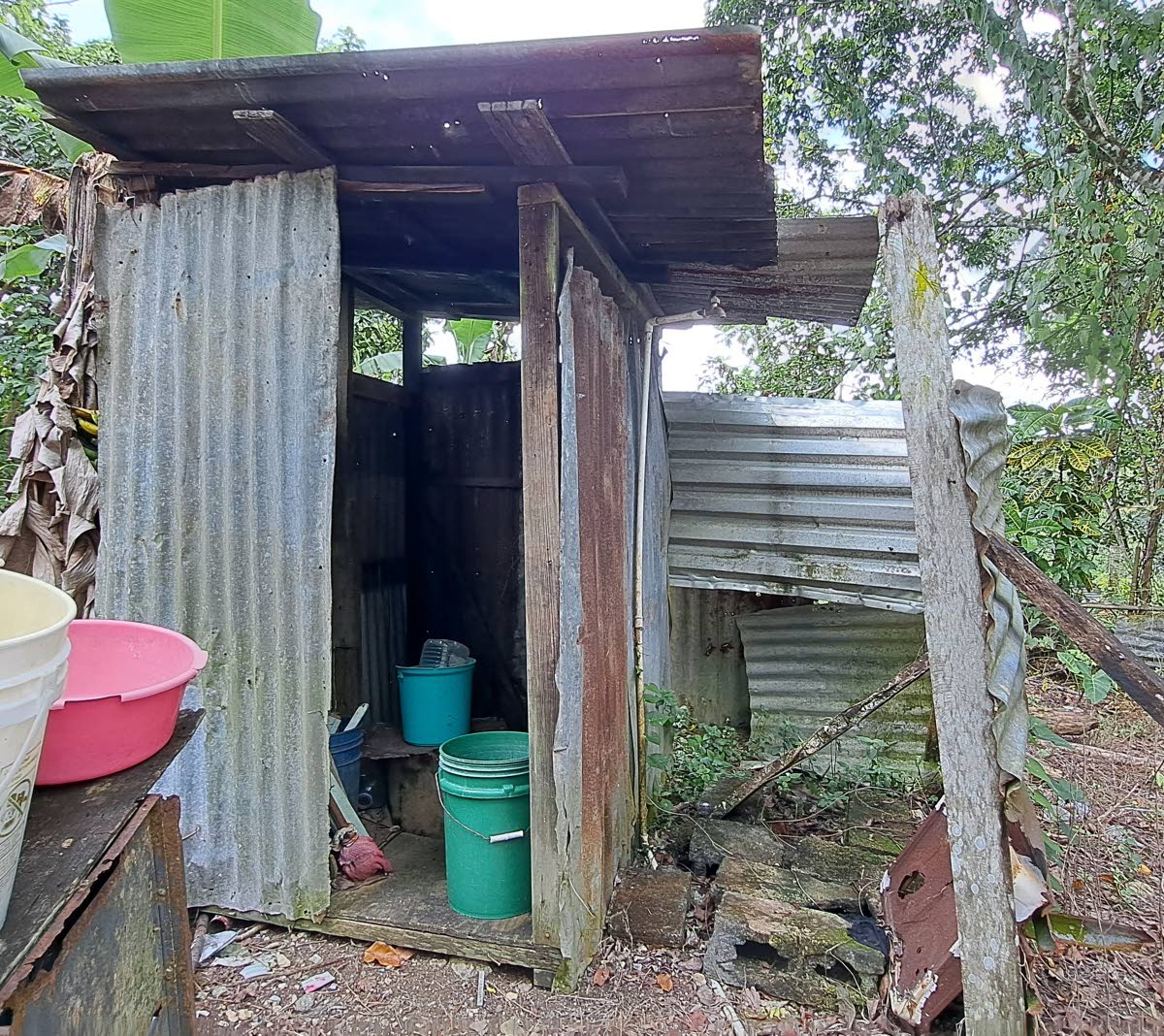 A makeshift bathroom, made out of zinc, consists of a pit toilet and pipe that 84-year-old Beryl Little uses at her home in Chester Castle, Hanover.