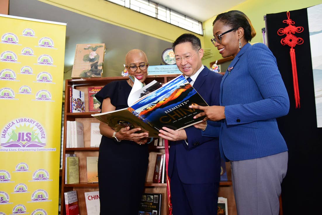Minister of Education and Youth, Fayval Williams (left), Ambassador of the People’s Republic of China to Jamaica, His Excellency Chen Daojiang, and Senior Director, Jamaica Library Service, Kishma Simpson, peruse a publication during the recent Chinese Collection Handover Ceremony at the Kingston and St. Andrew Parish Library.