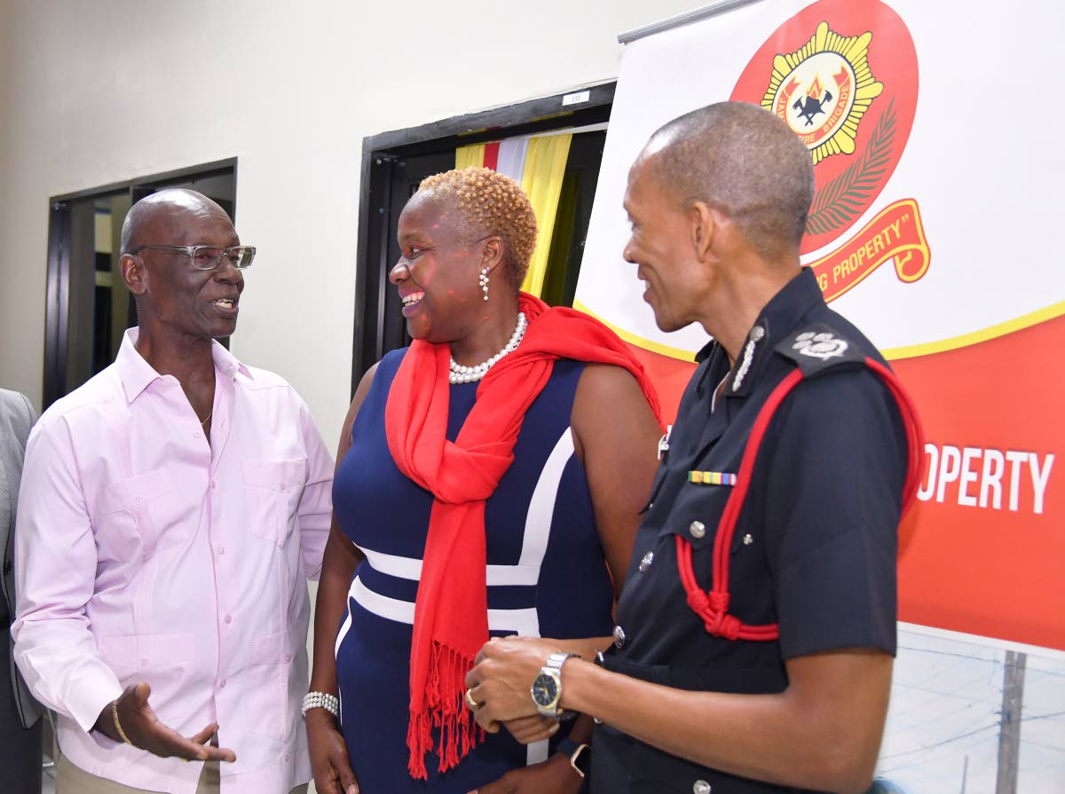 Minister of Local Government and Community Development Desmond McKenzie (left) converses with senior lecturer, University of Technology, Dr Nadine Maitland, and Commissioner of the Jamaica Fire Brigade Stewart Beckford at the media launch of the Jamaica Fire Brigade’s Fire and Life Safety Awareness Week at the Ministry of Local Government and Community Development in St Andrew on October 23. The week is being observed under the theme ‘Embracing Digital Innovation to Improve Fire Safety’. The week of activities will run from October 27 to November 2.