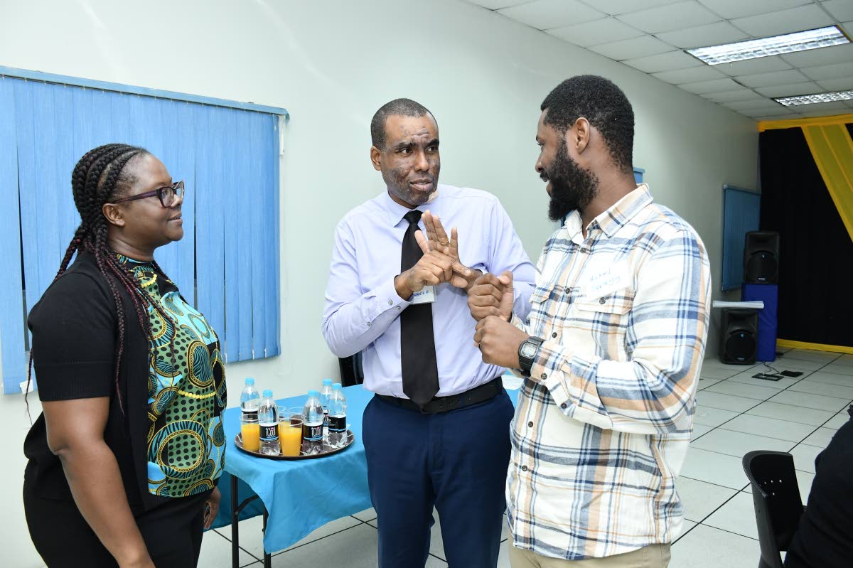 Hughen Spencer (in the middle) a sign-language interpreter at Interpreting Solutions, facilitates communication between Richard Spragg (right) and Villet Kelly-Bennett, a financial and investment specialist at ACDI/VOCA.
