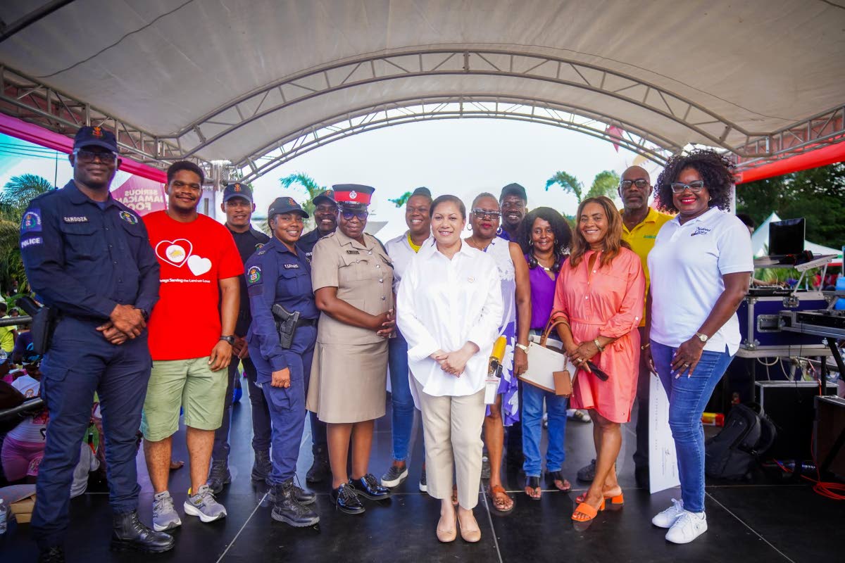 Custos of Clarendon, Edith Chin (centre), shares a moment with members of the police force and other stakeholders during a treat for children at The Verandah at the Juici Empowerment Park in Clarendon.