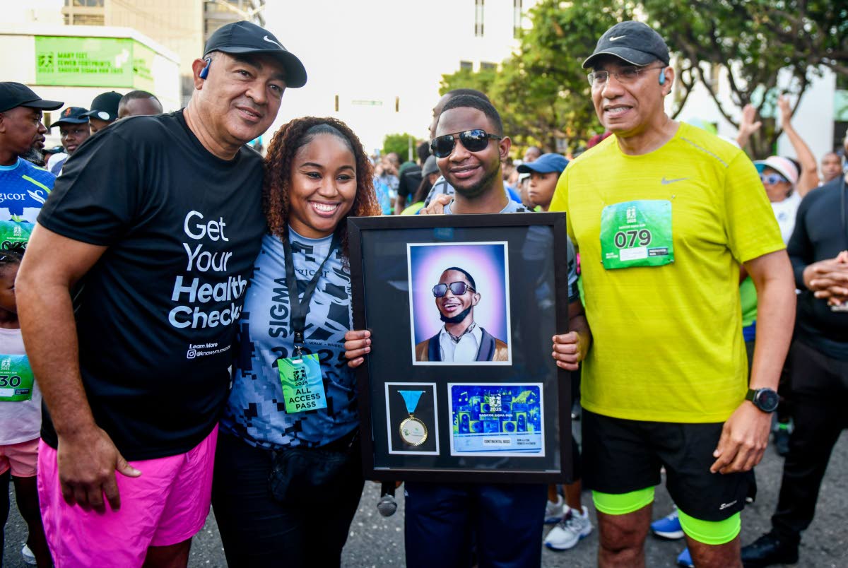 Health Minister Dr Christopher Tufton(left) and Prime Minister Dr Andrew Holness (right) with musical artiste Nigel ‘Nigy Boy’ Hector and his Sagicor supporter at the Sagicor Sigma Run 2025 held in New Kingston yesterday.