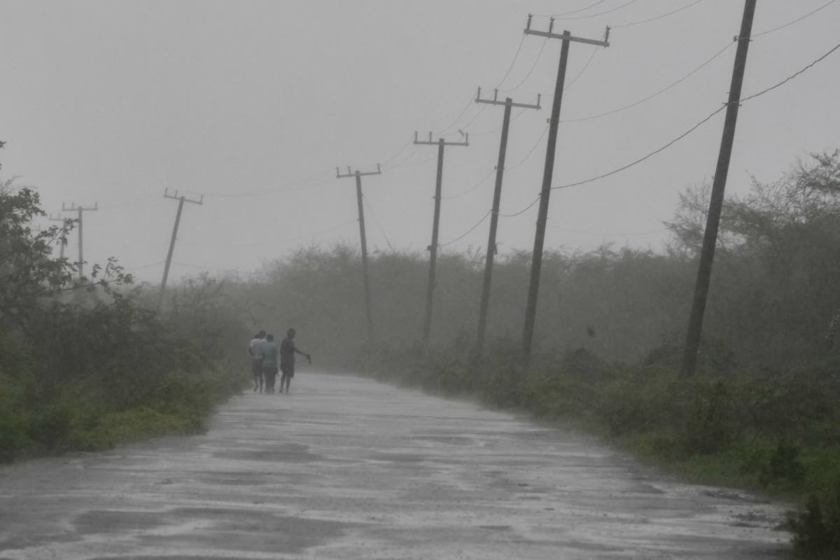 People walk along a road during the passing of Hurricane Melissa in Rocky Point, on Tuesday.