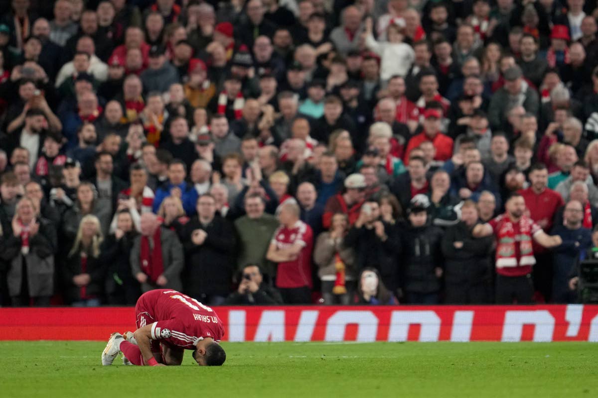 Liverpool's Mohamed Salah celebrates after scoring his side's fourth goal during the second leg of the Champions League round of 16 football match between Liverpool and Galatasaray, in Liverpool, England on March 18, 2026. (AP Photo/Jon Super)
