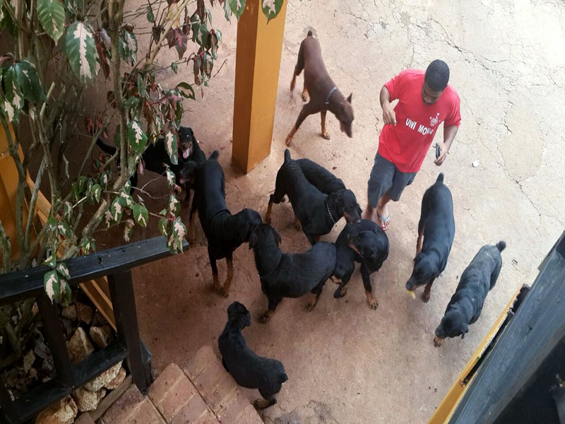 Jackson first got Sacha and Wallie (the Dobermann) as guard dogs. After they had pups, he just couldn't find it in himself to part with them. These dogs are like humans and full of personality. Wallie is the oldest and has been with Jackson for six years. But when describing who the leader of the pack is, Jackson boasted, "I am the leader of the pack. My deputy is Wallie. I know this because he is the ringleader and, when I am not around, he tries to dominate the others. But his dominance is now being challenged by his son Bem-his."