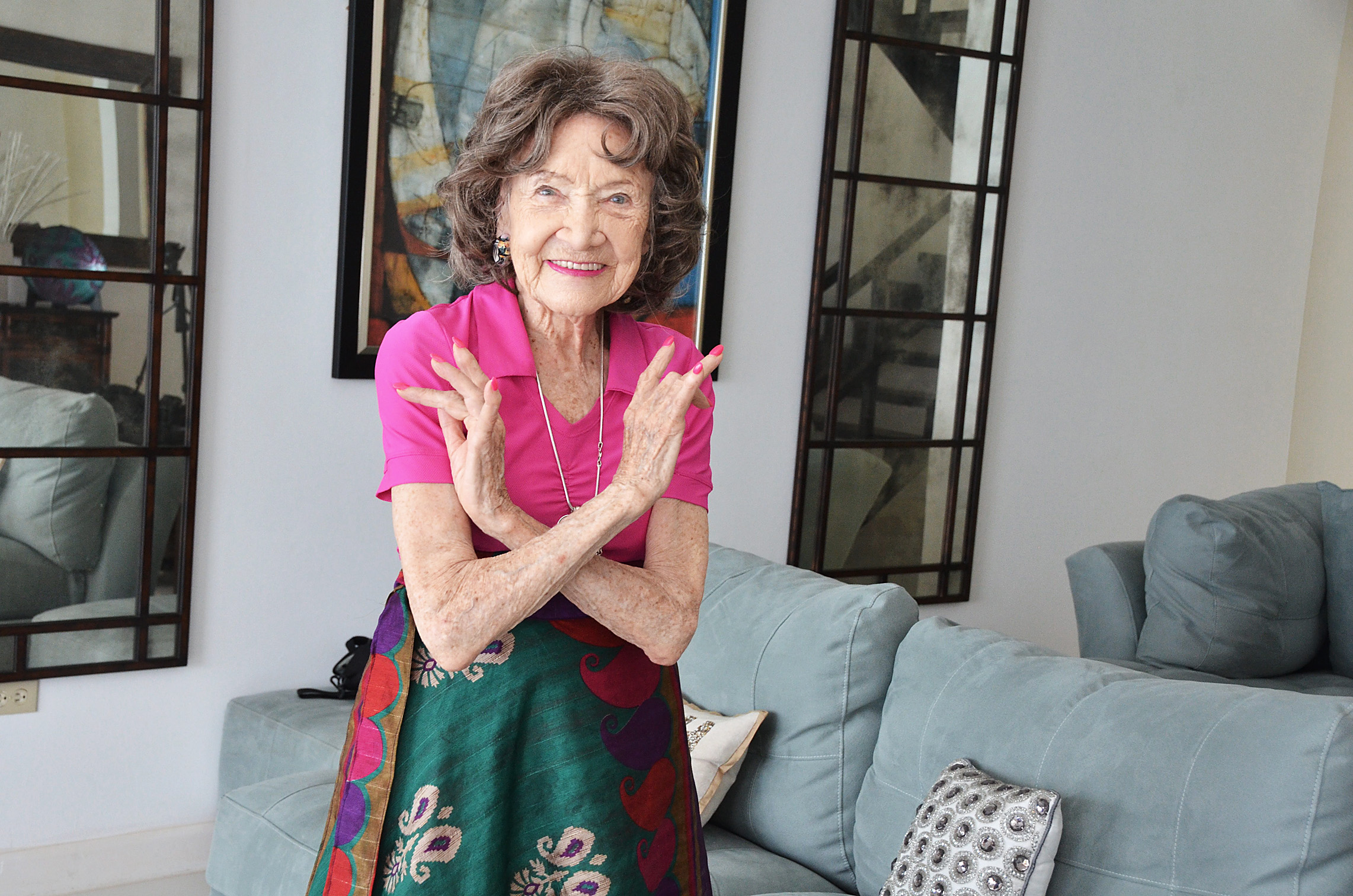 Tao Porchon-Lynch showing off one of her popular yoga moves during an interview with the Outlook Magazine at the Dreamtime Villa in Mahoe Bay, St James