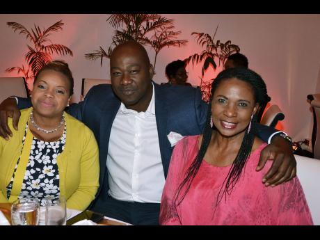 From left: Peter Williams, Ella Drummond-Hoyos and MyKul Cartwright share lens at Doneth Cartwright's 50th birthday party at the Valencia LM by Spanish Court in Kingston last Saturday night.