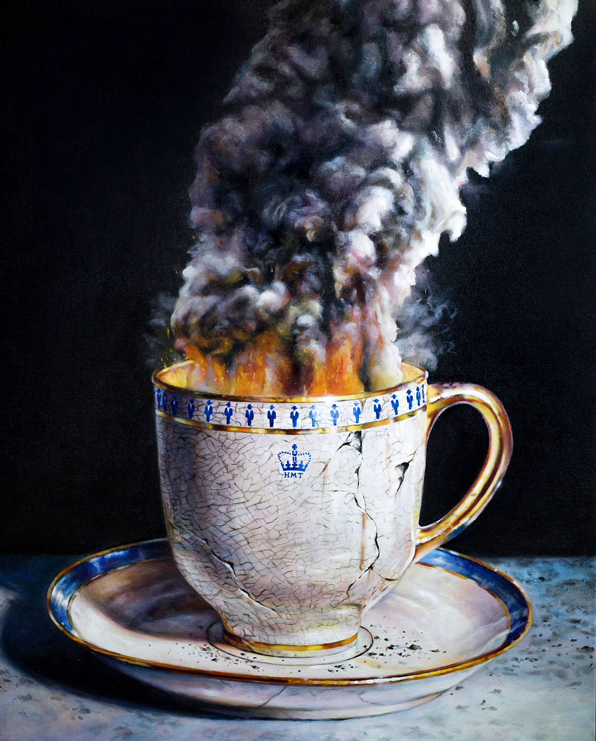 Painting a picture of epic proportions, he continued by saying, "I used symbolism in my work quite often to represent my ideas. So I thought, 'What could I use to represent this story?' I chose to implement something that is customary to the British: teacups, teabags, teapots. The theme of tea represents the idea of friendship, togetherness and hospitality, which the migrants should have received. But the process wasn't about just painting teacups and other chinaware. It was about distorting them and depicting an indigestible cocktail that represents the scandal in question."