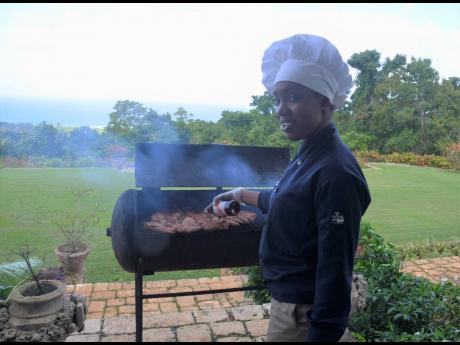 Adgura, aka Chef Irie focuses while she added beer to the jerk chicken that went as a par of the meal that visitors parttook of during the Flaours of Jamaica tour at the Great House located at Yaaman Adcenture Park.