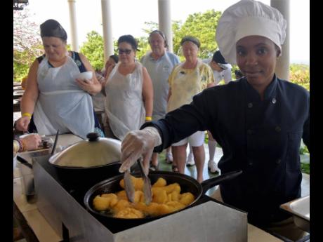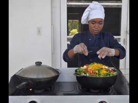 Adgura, aka Chef Irie focuses while she added thyme to the steam vegetable that went as a side to the meal that visitors parttook of during the Flaours of Jamaica tour at the Great House located at Yaaman Adcenture Park.