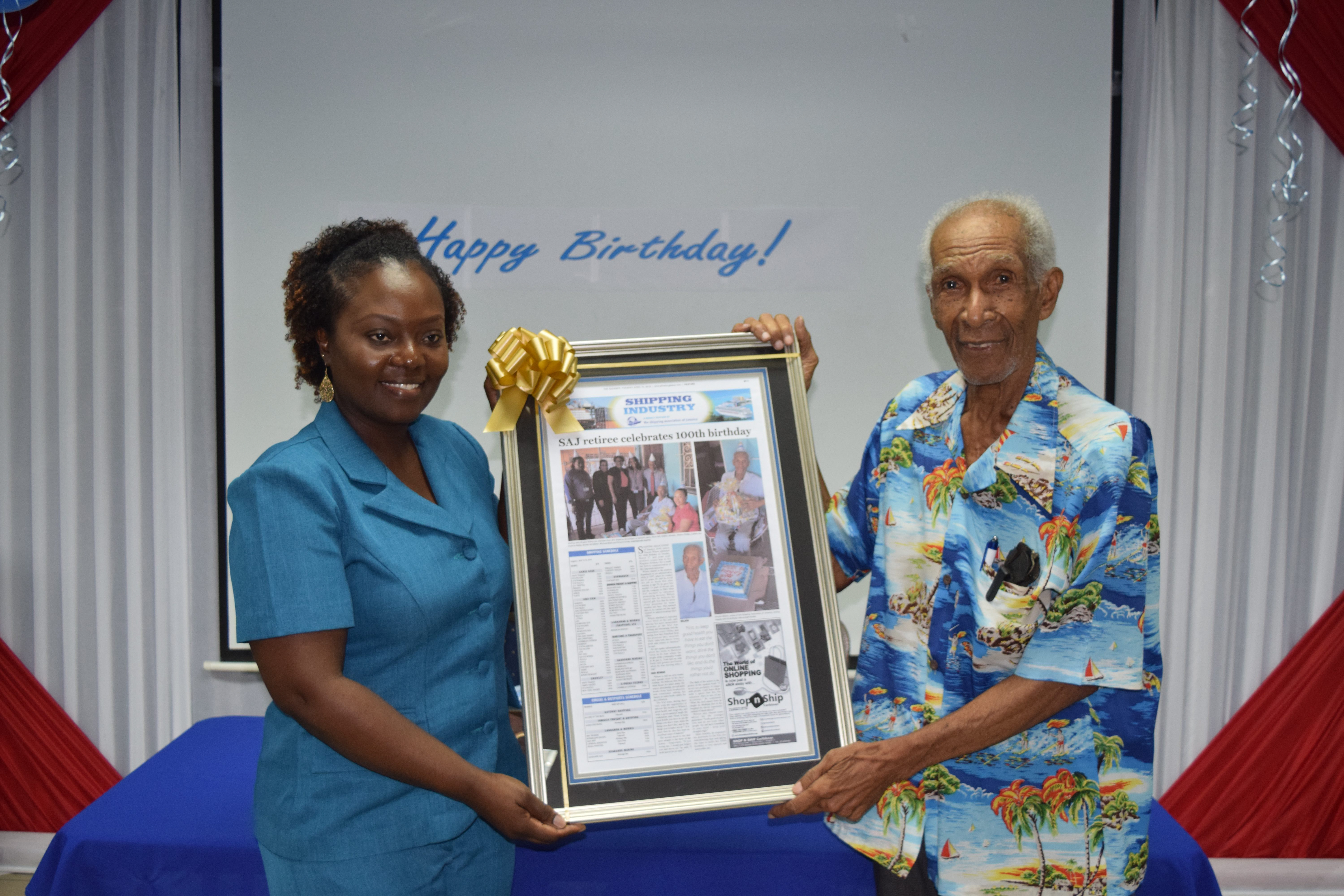 Shipping Association of Jamaica employees were not satisfied to visit former employee Mr Vincent Wilson on his birthday earlier this year, so they planned a full birthday party for him at the Association's Fourth Avenue Offices. Radiant at 100, Mr Wilson quoted Shakespeare in his reply speech and was genuinely touched that his former employees marked his milestones with so many kind expressions of regard. Here are some pictures of the festive occasion: