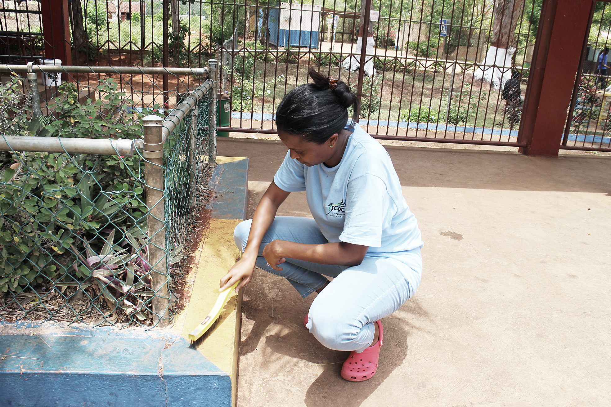 Digicel’s Trisha Williams-Singh, in her role as chairman of the board of her alma mater New Forest Primary, Junior High and Infant School, preps an area for painting during the massive clean-up and painting exercise at the school on Labour Day.