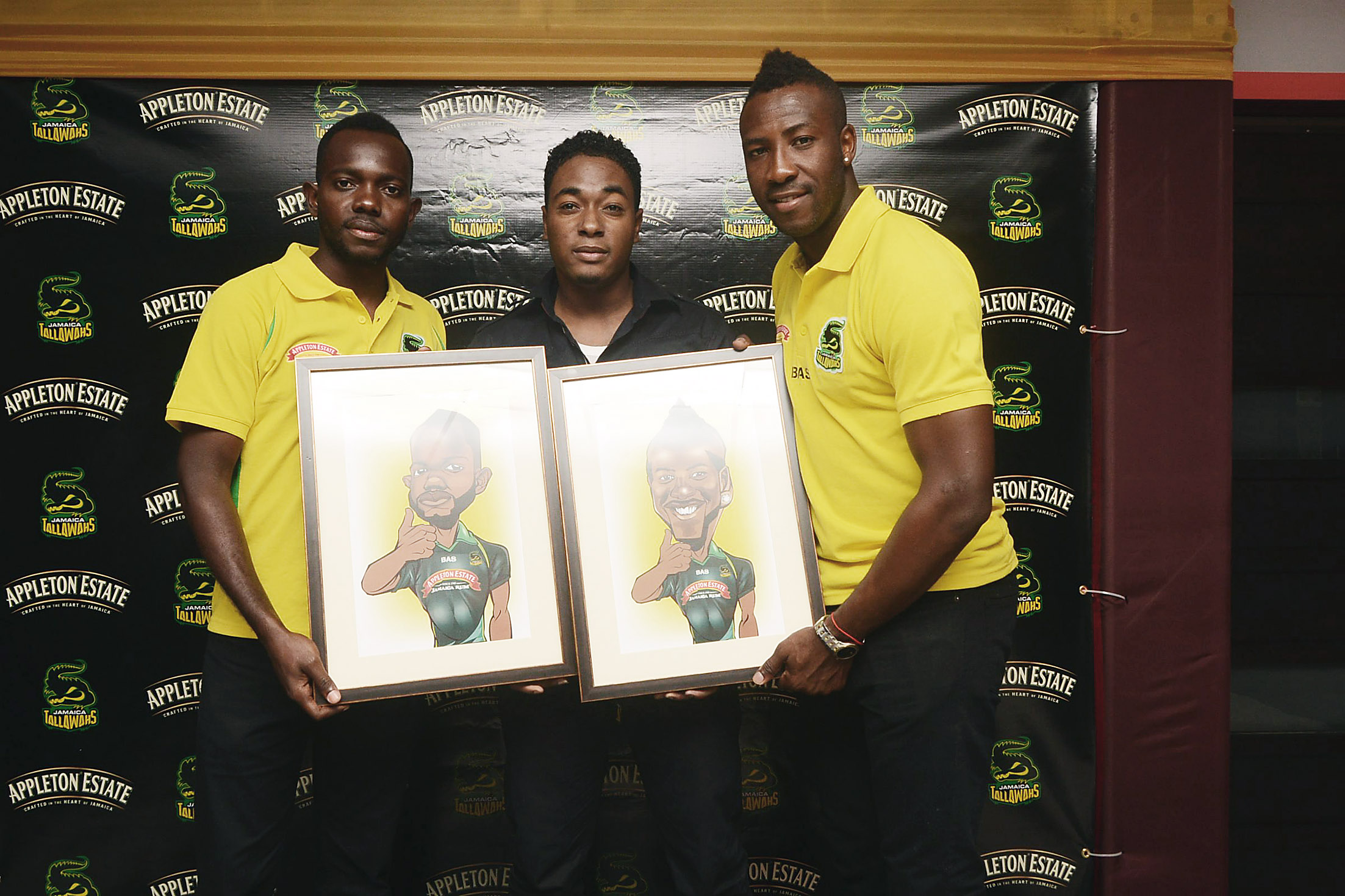A BOLD PICTURE: Jamaica Tallawahs team members Nikita Miller (left) and Andre Russell (right) join caricaturist Emerald Easy in posing with their signature gift items – caricatures of themselves – at the good luck cocktails hosted by Appleton Estate on June 17 at The Bar@twentythree.