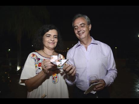 Argentina Ambassador to Jamaica Ariel Fernández and Mexican Ambassador Cecilia Jaber light a candle during the celebration of the Mexican tradition, posada.