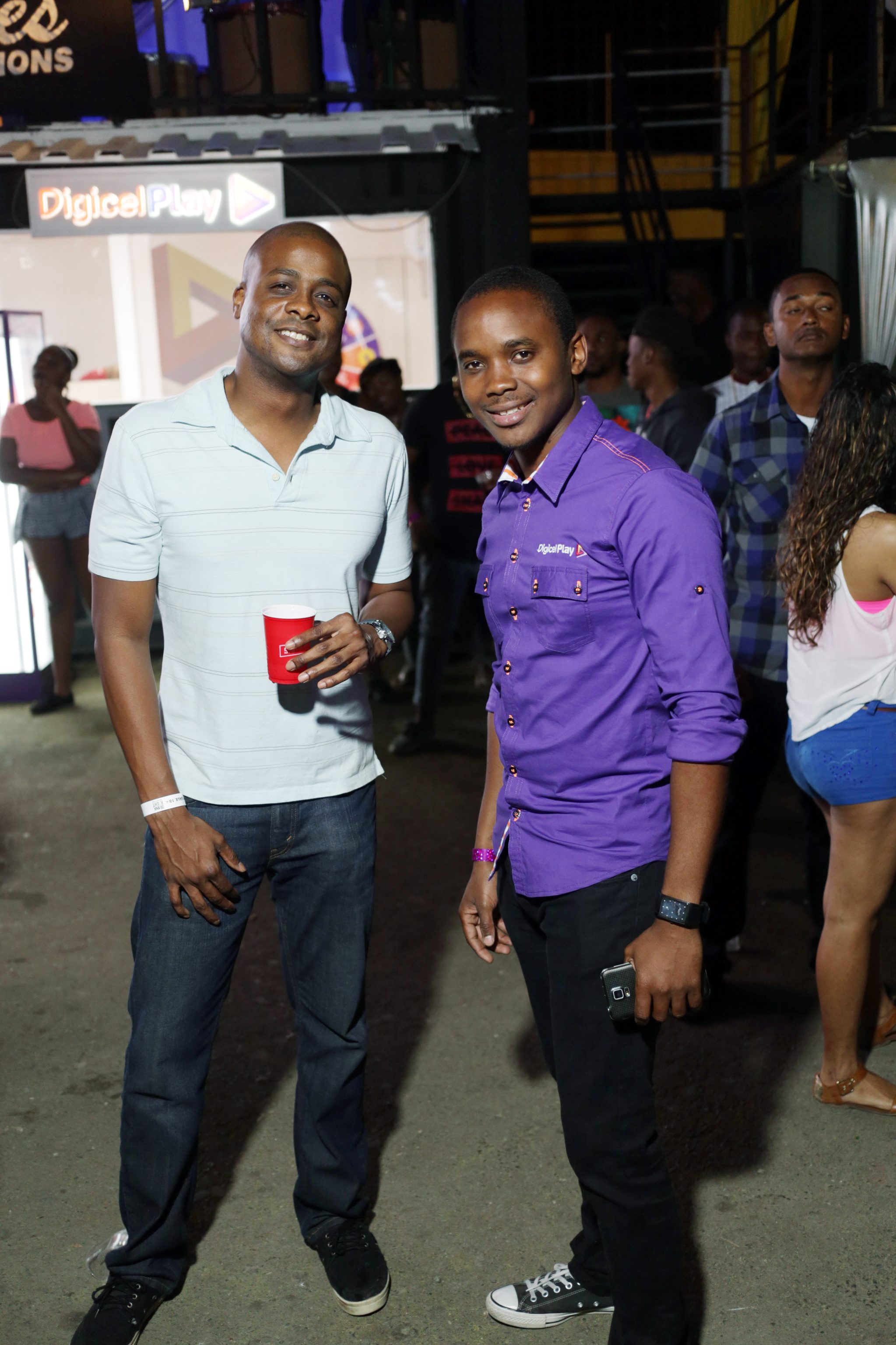 Digicel’s Senior Sponsorship and Development Manager Kamal Powell (right) catches up with Keenan Henry, area marketing manager of Lucozade, at the opening night of Bacchanal Fridays, held at Mas Camp on February 12.