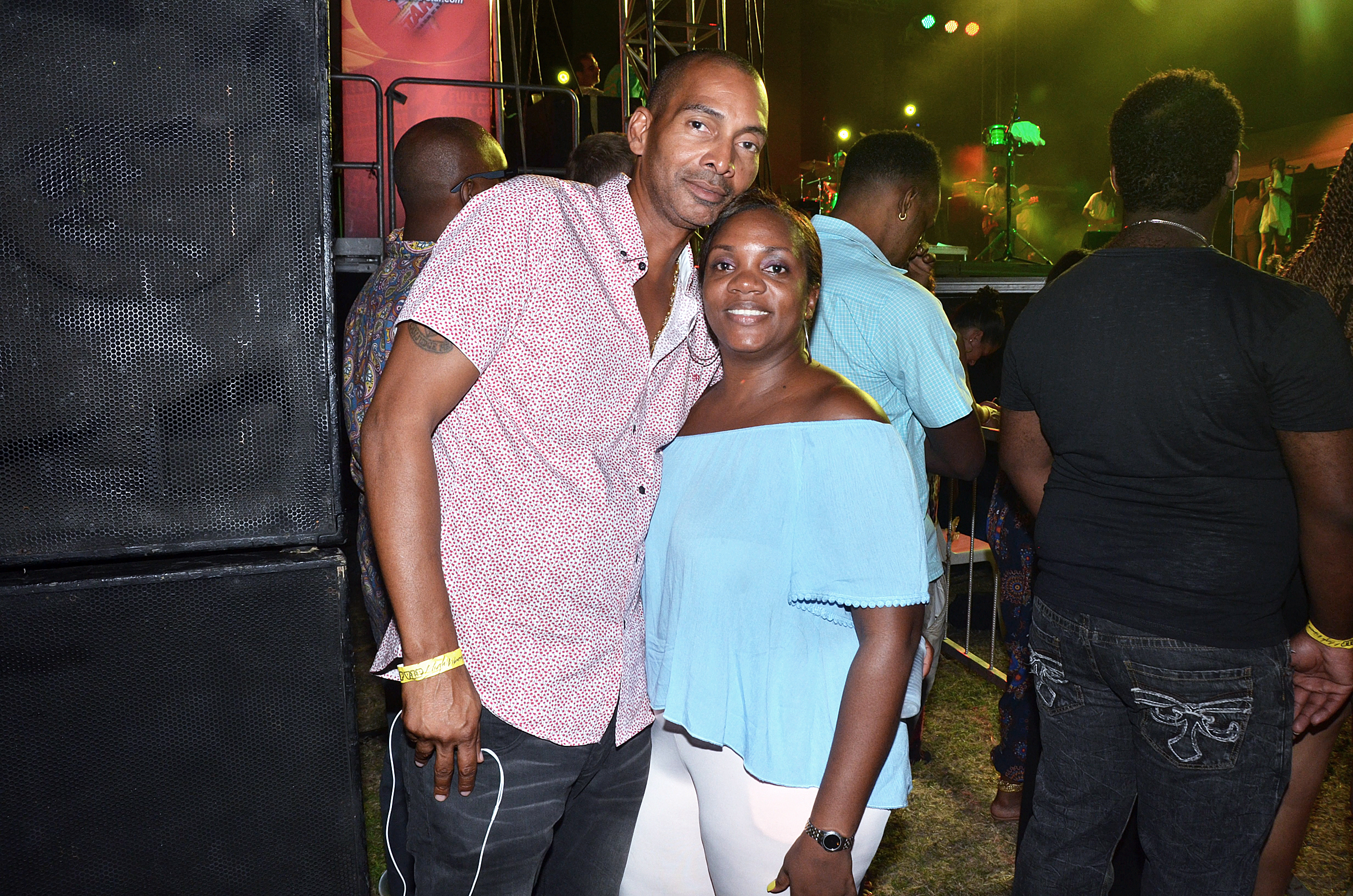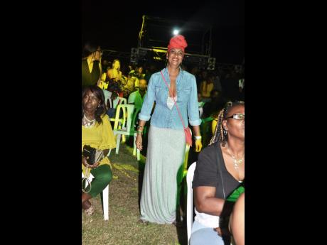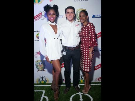 Former Reggae Boyz Ian ‘Pepe’ Goodison (left) and Ricardo ‘Bibi’ Gardner (right) give some love to Nasha-Monique Douglas, senior brand manager for Red Stripe, at the RSPL Launch.