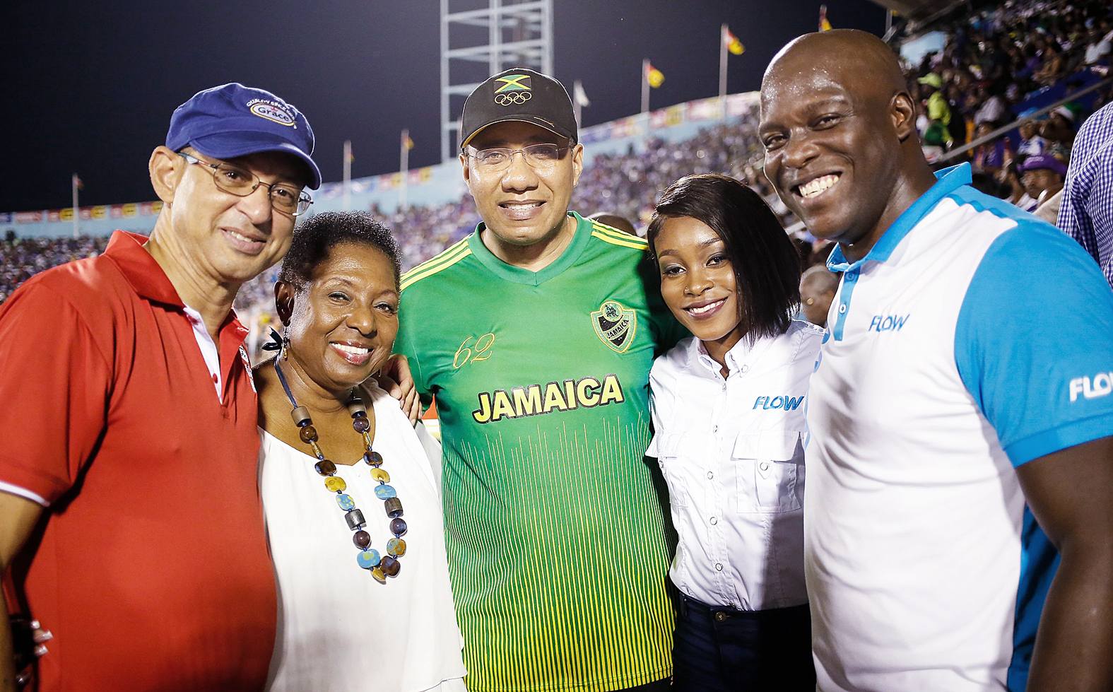 From left: Don Wehby, CEO of GraceKennedy; Minister of Sports Olivia Grange; Prime Minister Andrew Holness; Olympian and FLOW ambassador Elaine Thompson; and Stephen Price, newly appointed managing director of FLOW Jamaica, are all smiles on the last day of Champs at the National Stadium.