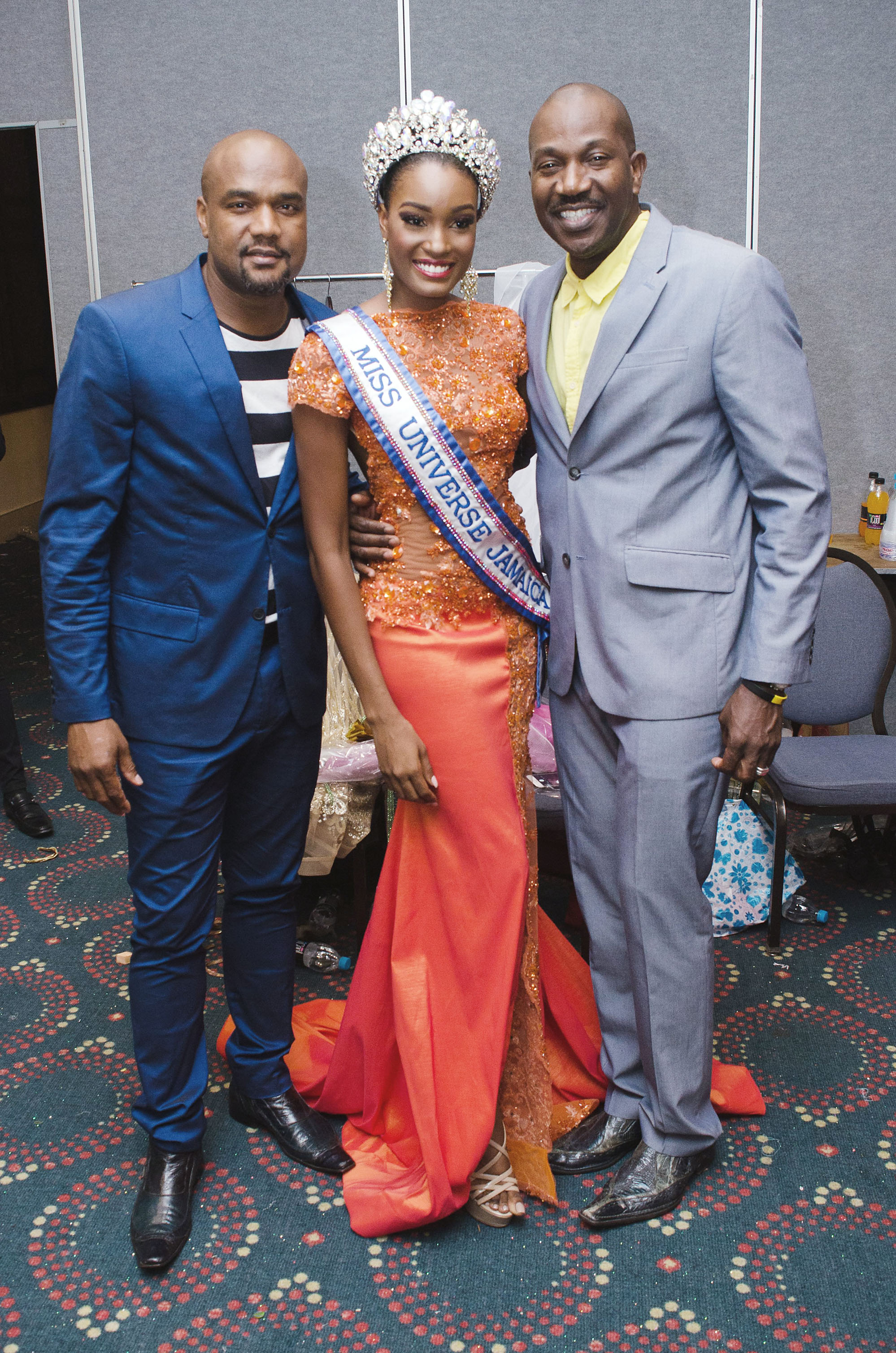 National directors of Miss Universe Jamaica Mark McDermoth (left) and Karl Williams flank their new queen, Davina Bennett.