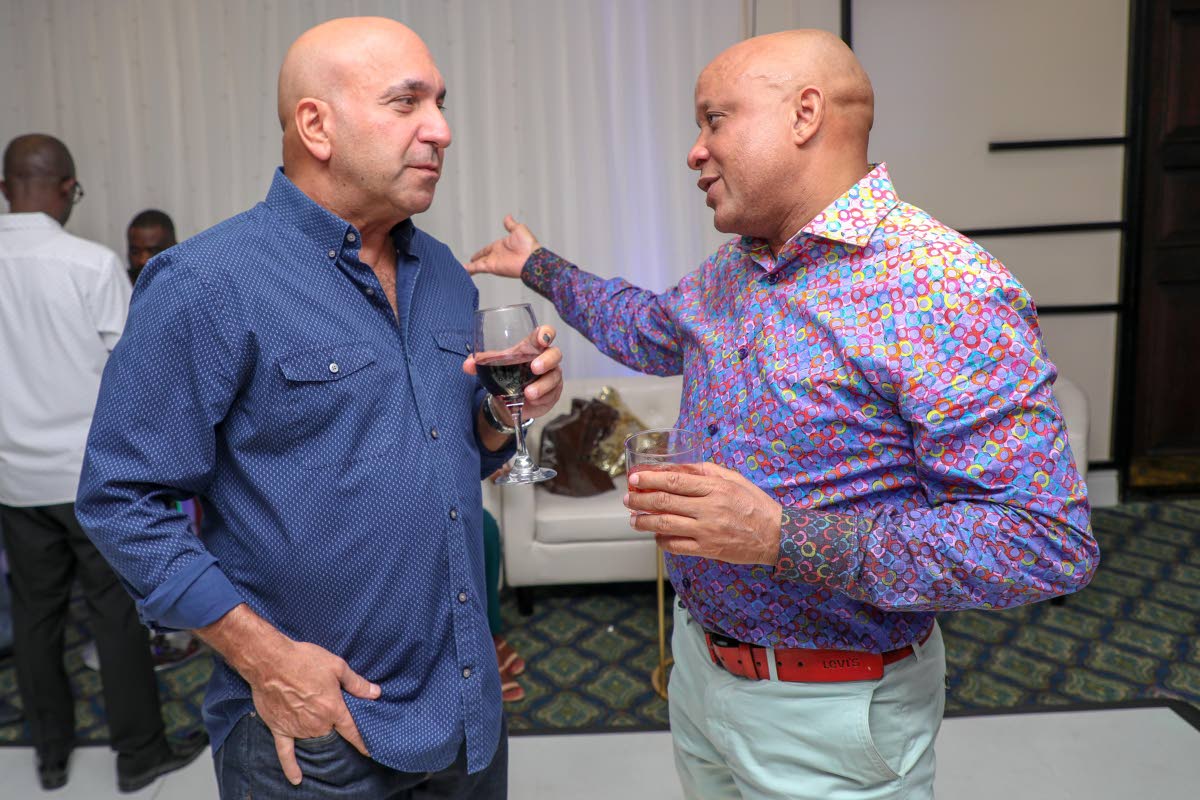 Patrick Sinclair (left), branch manager, Montego Bay; and Errol Moss, unit manager, enjoy a lively discussion ahead of the evening’s activities.