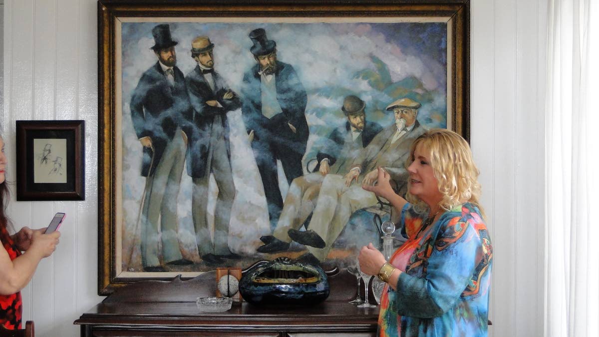 Marina McCullen discussing a Barry Watson masterpiece mounted inside Orange Park Great House.