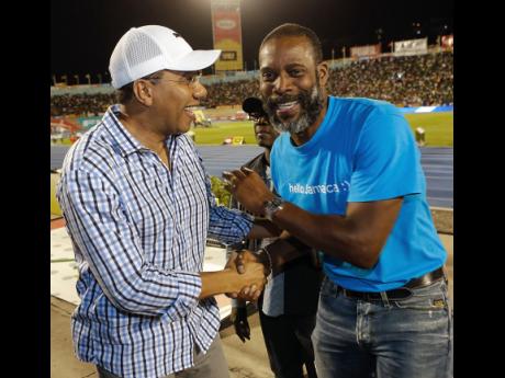 Garry Sinclair (right), managing director at FLOW, greets Prime Minister Andrew Holness on the trackside as they enjoy the final day of the ISSA/Grace Kennedy Boys and Girls' Championships.