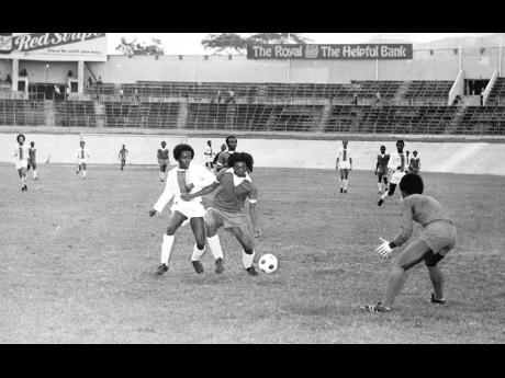 Mark Cobran (centre) of Liguanea United shields the ball from Paul Williams of Elletson Flats in their Major League football match at the National Stadium in October 1975. At right is Liguanea’s goalkeeper Robert Noble. Liguanea United won the game 3-0.