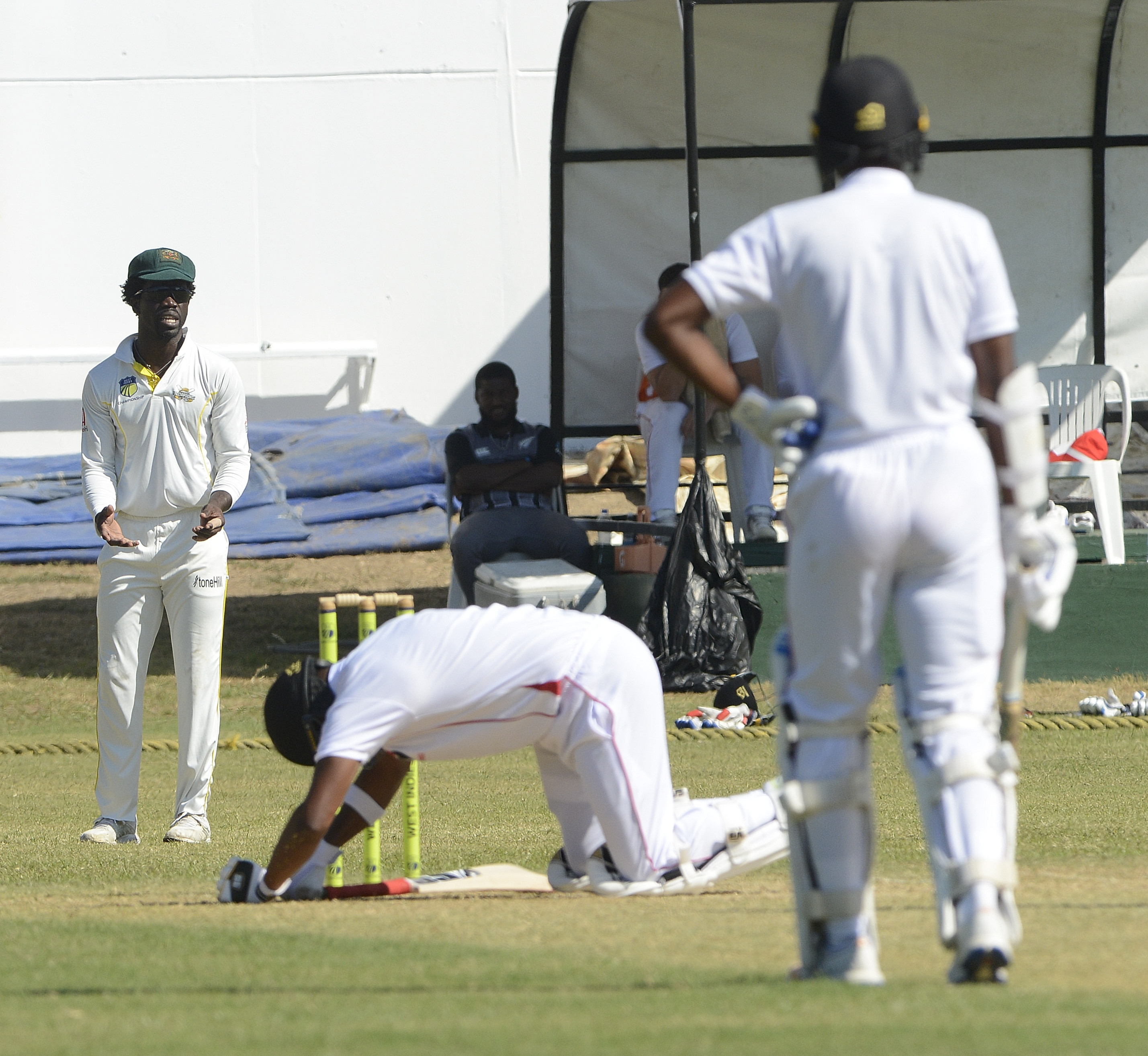 Before the suspension of play, Trinidad and Tobago Red Force batsman Darren Bravo, who is unbeaten on six, repeatedly complained to the umpires. The on field officials, after consulting with third umpire Christopher Wright and match referee Denovan Hayles, for approximately ten minutes, agreed to call a halt to the proceedings.