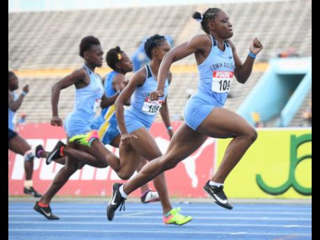 Kevona Davis of Edwin Allen High pulls away from the field to win the Under-20 Girls 100 metres in 11.46 seconds at the Carifta Trials yesterday.