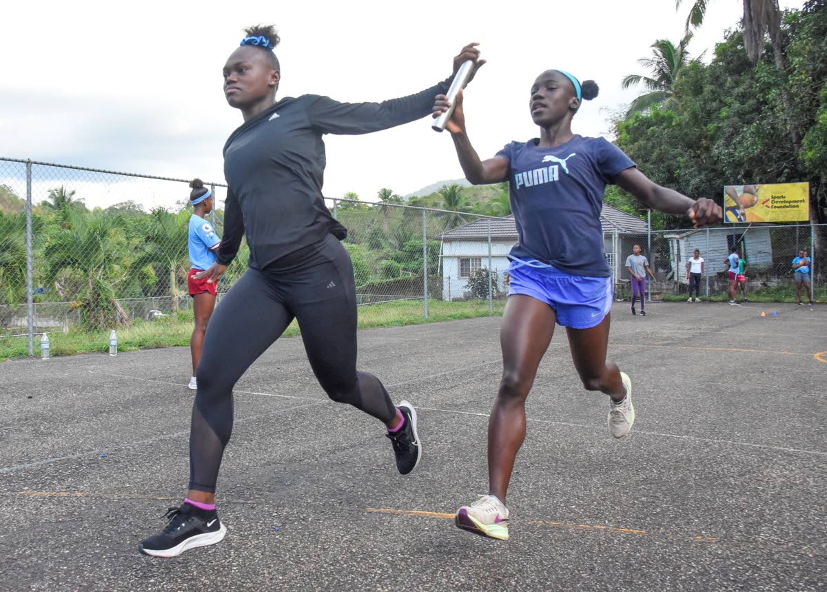 Edwin Allen High School’s Tonyan  Beckford (right) passes a baton to top sprinter Serena Cole during a training session at Edwin Allen High School in Frankfield, Clarendon, recently.