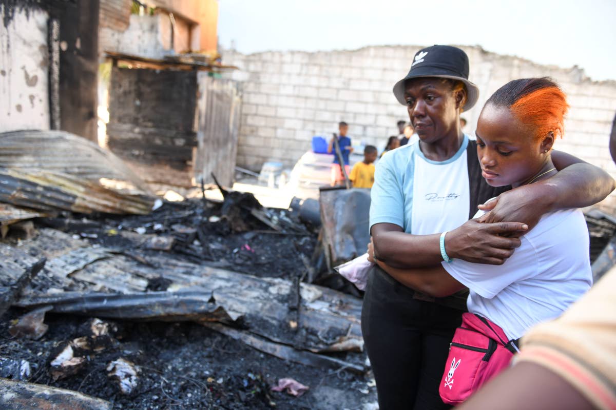 A despondent Carol Dick (left), mother of Latanya Wilson, holds her granddaughter Tobian Graham as she looks at the remains of her home on Rum Lane.
