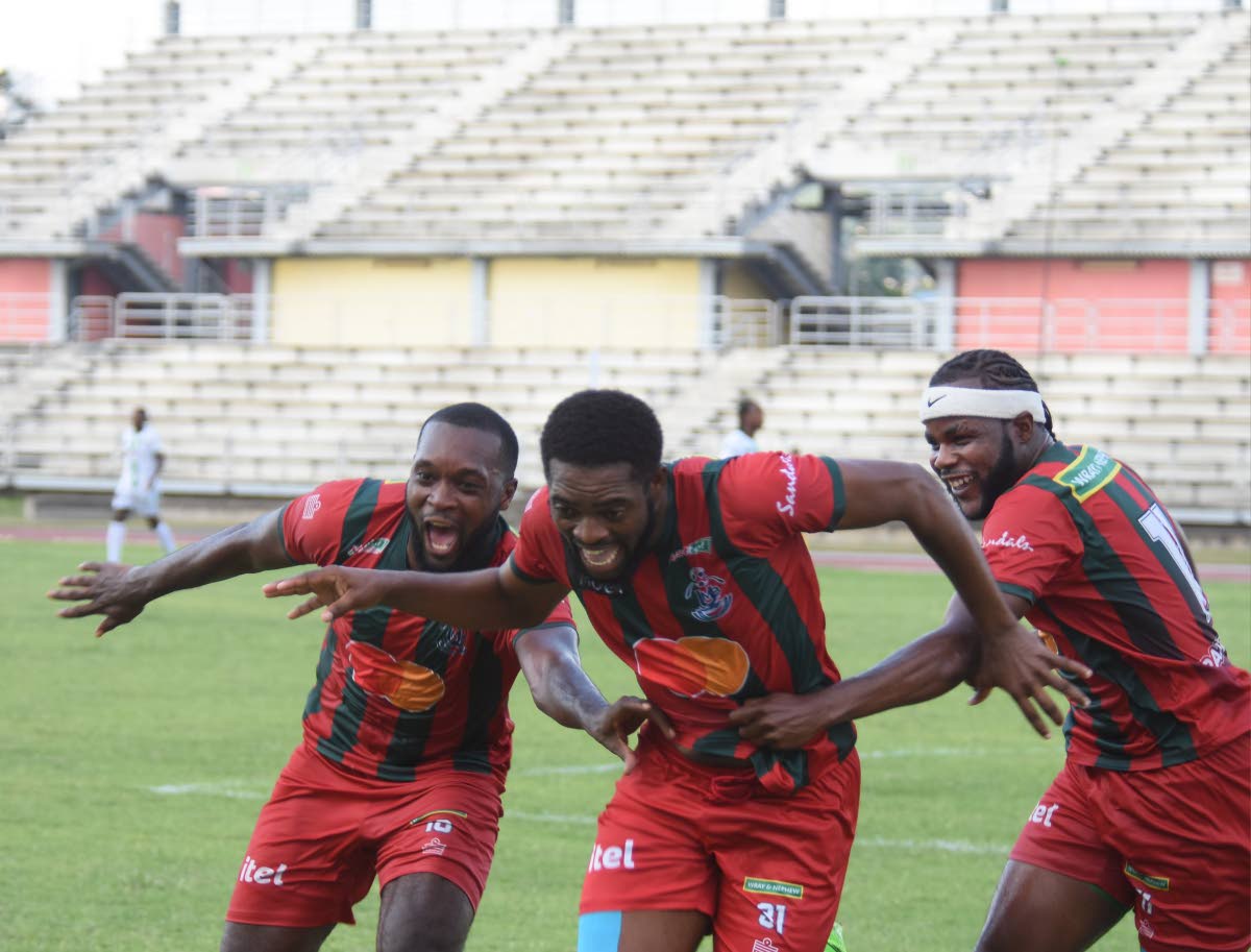 Montego Bay United FC’s Daniel Reid (centre) celebrates with teammates, Brian Brown (left) and Jourdain Fletcher, after scoring a goal during a Wray and Nephew sponsored Jamaica Premier League match against Tivoli Gardens at the Montego Bay Sports Complex in Montego Bay on Sunday, April 7, 2024.