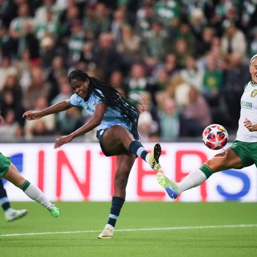 Reggae Girl Khadija Shaw strikes to goal during a Champions League game for Manchester City against Hammarby at the Tele2 Arena in Stockholm, Sweden, yesterday.