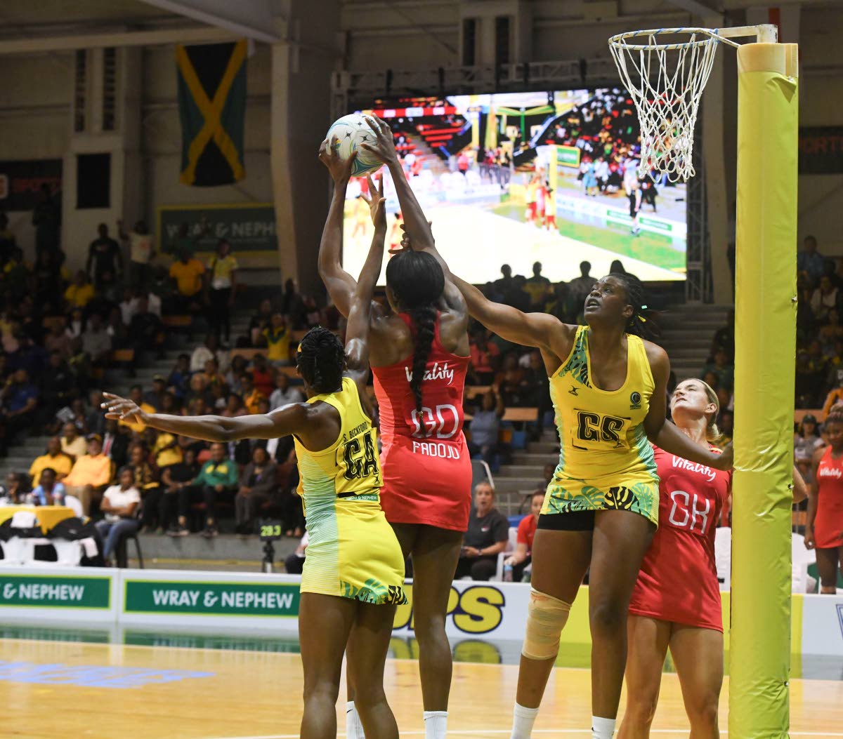 Sunshine Girls goal attack, Shanice Beckford (right) shoots during the final game of the Horizon Netball Series against the England Vitality Roses at the National Indoor Sports Centre last night. Watching closely are Sunshine Girls goal shooter, Romelda Aiken, (centre) and Roses goal defence, Funmi Fadoju.