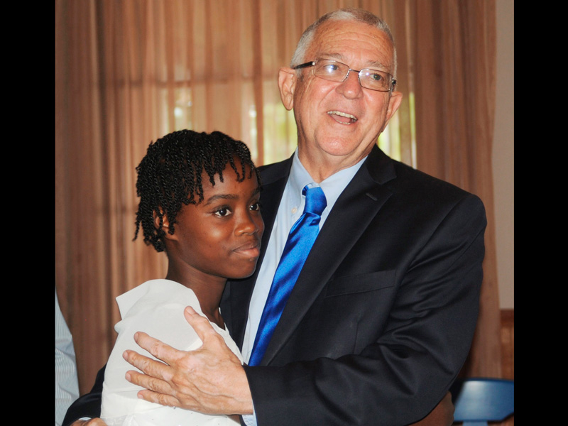 Minister of Education Ronald Thwaites gives a warm embrace to top girl, Britanie Ferguson, for winning an East Central St James constituency education scholarship award. They were in attendance at a luncheon put on by Sunset Beach Resort, Spa and Waterpark. - Photo by Paul Clarke