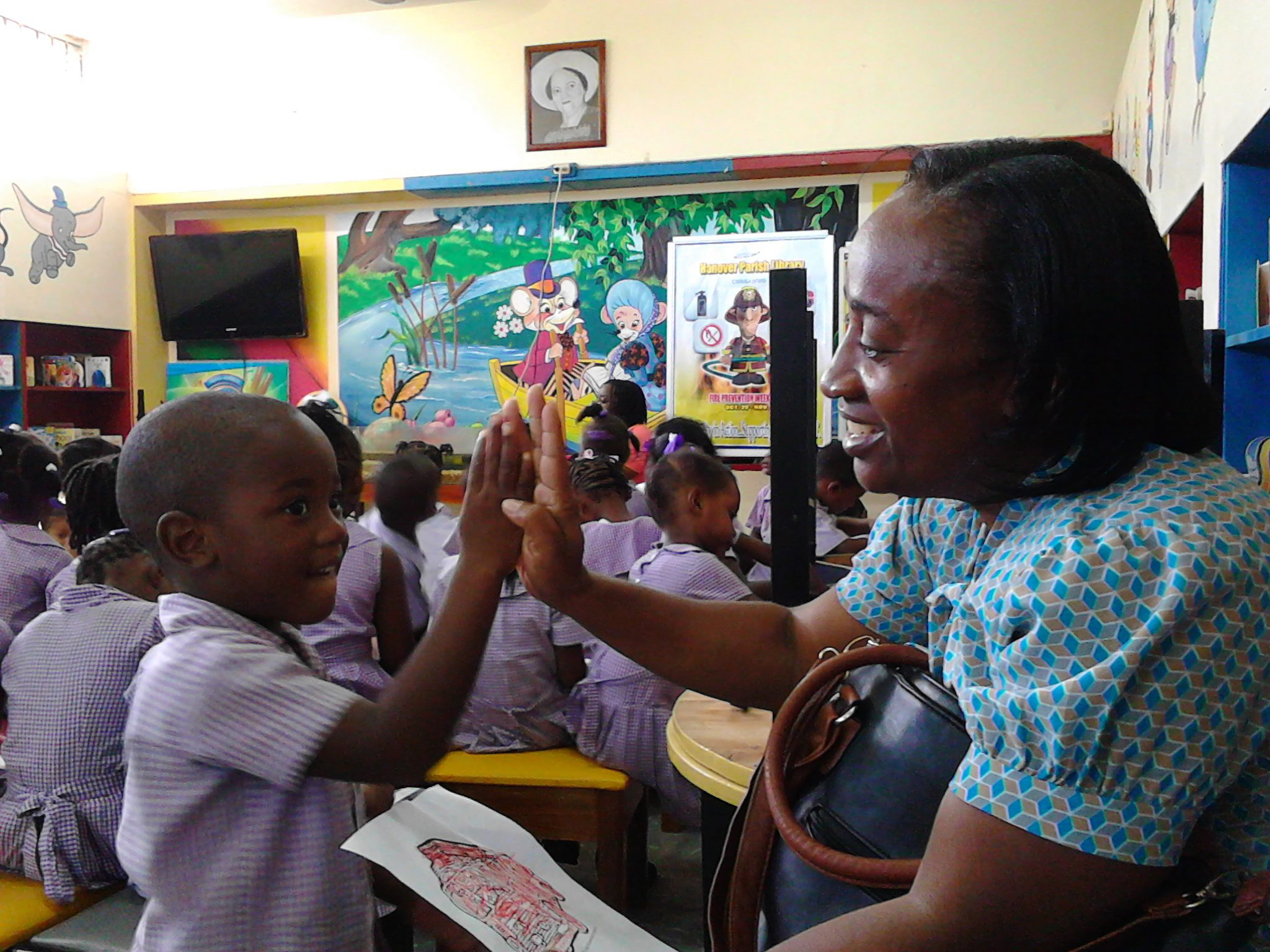 Four year old Elgin Town Basic School student, Giovanni Gordon gives a hi-five to his teacher Nazaree Atkinson during the Hanover Fire Department's presentation at Weenie Wednesdays at the Hanover Parish Library.