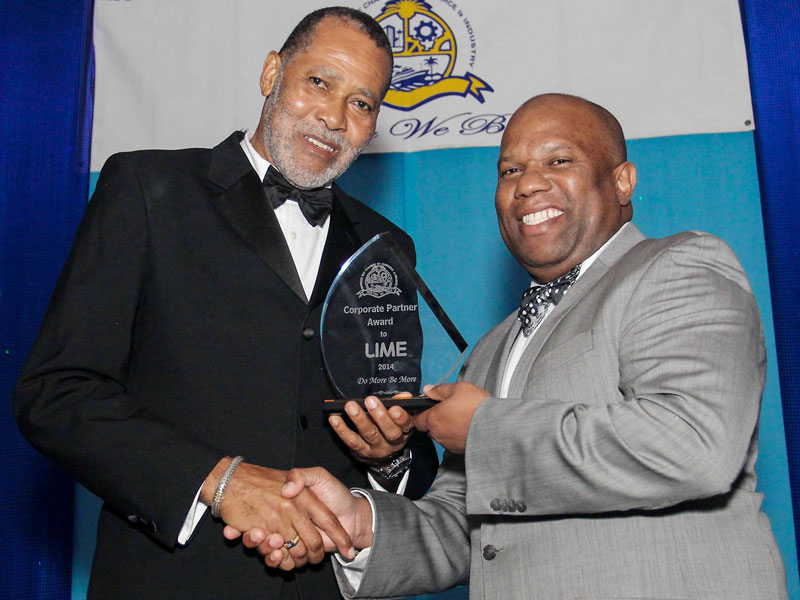 Norman Naar (fourth right), vice-president, government and enterprise sales at LIME, with members of the LIME team. The company was named Corporate Partner of the Year by the Montego Bay Chamber of Commerce and Industry at its awards ceremony held last weekend. Also celebrating the moment are (from left) Andrew Mullings, head of pre-sales services; Davalle Grant, SME sales executive; Shauna Williams, business sales executive; Dexton McDonald, regional head of business services; Marsha Campbell, human resources business partner; Tanisha Davis, sales operations manager; Dennis Minott, service manager; and Elon Parkinson, corporate communications manager.