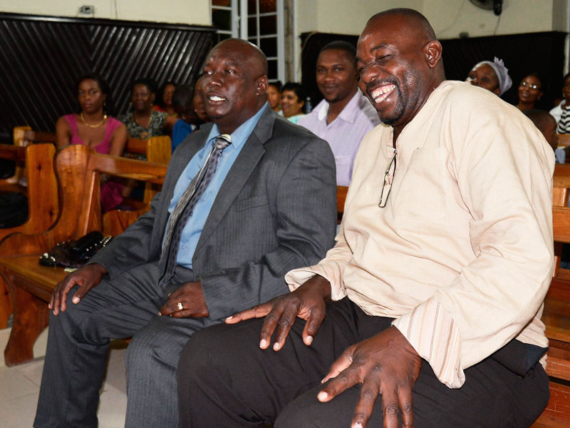 .Popular Lucea taxi driver Geoffery Grant (left) and his church brother, Leon Wilson, enjoy themselves during the praise-and-worship segment.