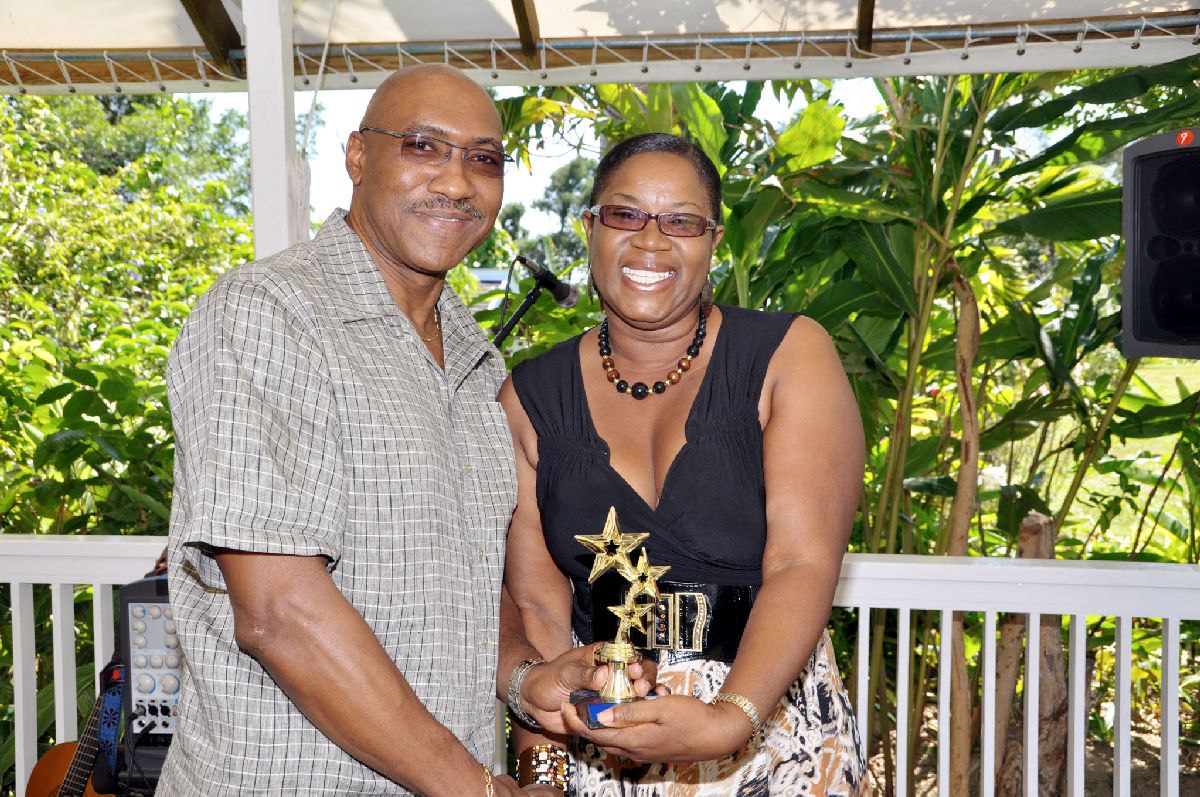 Glendon Gordon, vice-president, individual life, Guardian Life Limited, presents Anlyn Nemb-hard, insurance advisor, Man-deville branch, with her trophy. The occasion was Guardian Life's Guardian Stars function, which recognises top performers.